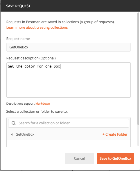- for the description write something that best describes the role of this request. In our case, it is to “Get the color for one box”.